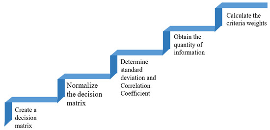 This method, as stated, gives a higher weight to attributes or criteria with a significantly high value of standard deviation and low value of correlation in comparison to all other criteria [40]. Specifically, a high value of Cj indicates the maximum amount of information yielded by the provided criterion, implying that the importance of criterion for the problem of decision making is greater.