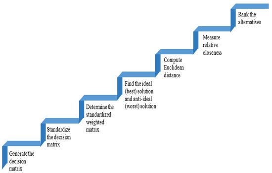 The TOPSIS approach is depicted in Figure 9 as a series of steps. Following is the description of the procedures or the steps.