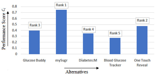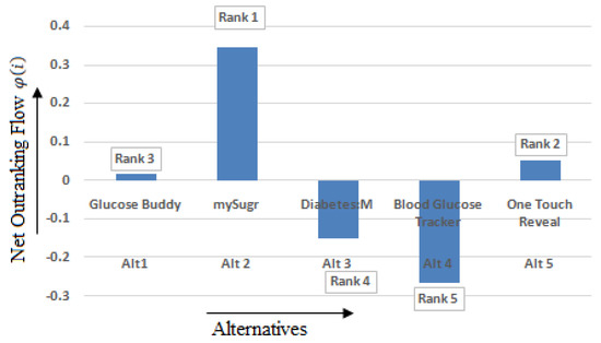 - PROMETHEE II is used for calculating the net outranking flow (φ(i)) of T2DM applications. The (φ(i)) value obtained in our study ranges between −0.26391893 and 0.344439094. A higher (φ(i)) value indicates best alternative. From result analysis, it was observed that, in PROMETHEE II, the mySugr application is the best mHealth application with the maximum (φ(i)) value.