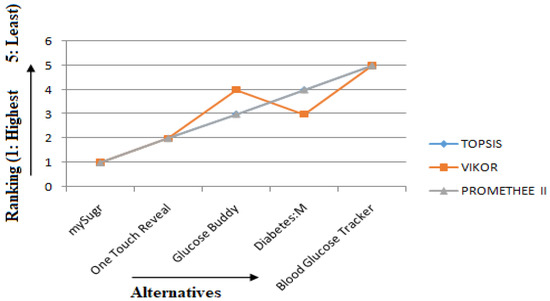 - A comparison study was carried out among the three MCDM models to check the consistency of the result. It was observed that all the three models show almost the same ranking for the five alternatives, with the mySugr application as the best and the Blood Glucose Tracker as the least preferred application among the users.