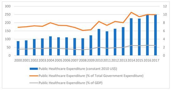 Recent years have witnessed an effort to improve health care services, with a significant increase in the allocated budget, ranging from 6.9% of the government’s total budget in 2000 to 10% in 2017 [5]. Figure 1 shows the increasing trend in Public Healthcare Expenditure in real terms (constant 2010 US$) and as a percentage of Total Government Expenditure. Despite the substantial resources that the government is currently able to allocate, the health care system is increasingly under strain as a result of the most pertinent challenges faced by all publicly funded health care systems; rapid increases in expenditures and demand while resources remain finite. These challenges include an ageing population, an increase in sedentary lifestyles, rising costs, increasing user expectations and changing disease patterns [6].