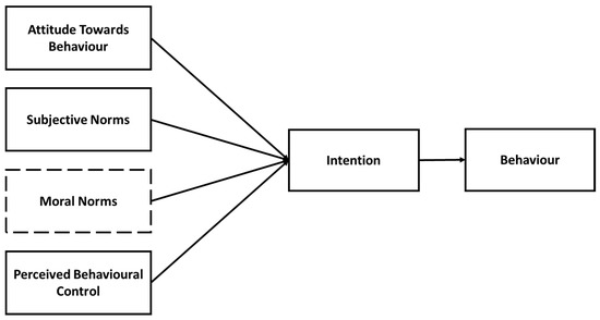 The main notion behind the TPB is that a person’s behavioural intention affects the final behaviour of an individual and is shaped by the person’s attitudes, social norms and perceived behavioural control regarding the behaviour in question. Attitudes refers the whether the final behaviour is viewed a positive or negative. Social Norms mean the perceived social pressure in engaging in the behaviour and Perceived Behavioural Control refers to the easiness or difficulty to perform the behaviour [60]. Ajzen [61] upgraded the theory to include moral norms. The latter signifies the moral satisfaction derived when performing a specific behaviour [62]. Theory of Planned Behaviour has been extensively used in WTP studies [25,62,63,64]. Figure 4 illustrates the TPB as to how Attitudes, Subjective Norms, Moral Norms and Perceived Behavioural Control affects behavioural intentions which in turn affects the final behaviour.