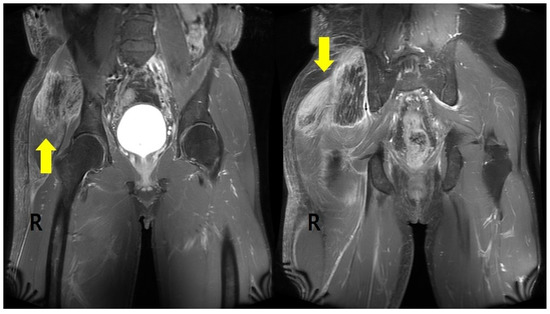 Soft tissue ultrasonography (USG) and pelvic magnetic resonance imaging (MRI) were performed on postoperative day 7. Generalized edematous swelling in the subcutaneous layer of the right buttock was found on USG with a geographic signal change of about 15 cm (longitudinal) in the right gluteus maximus, medius, and minimus muscles; edematous changes in these muscles and in the overlying subcutaneous layer were observed on pelvic MRI (Figure 1). These laboratory examinations and imaging findings were consistent with rhabdomyolysis from compartment syndrome.