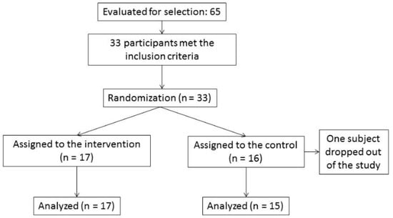 At the time of the study, the center had 65 professional employees. Of these, 33 met the inclusion criteria (Figure 1). Participants were assigned to groups following simple randomization (1:1) using a computer-generated random number sequence: resulting in the IG = 17 and CG = 16. One participant (in the CG) dropped out of the study because of illness, so the final sample consisted of 32 professionals. The IG (N = 17, 3 men, 14 women) had a mean age of 41.1 years (SD = 11.07), and the CG (N = 15, 9 men, 6 women) had a mean age of 39.1 years (SD = 12.54).