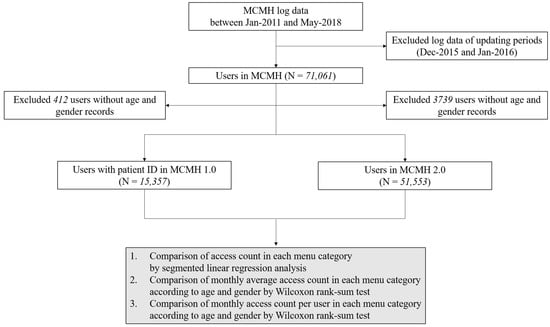 We compared the monthly average access count and monthly access count per user in each menu in MCMH 1.0 and MCMH 2.0 according to age and sex. The user group was divided into children and adolescents (below 19 years old), females under 50 (19 to 49 years old), males under 50 (19 to 49 years old), females over 50 (50 years or older), and males over 50 (50 years or older). The age of 50 was used to divide the adult user group considering that the prevalence of chronic diseases increases after that age. Figure 2 shows the study flow.