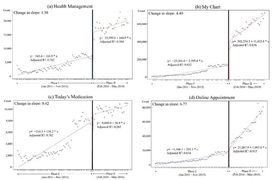 Segmented regression plots of the monthly access counts of (a) “Health Management” menu, (b) “My Chart” menu, (c) “Today’s Medication” menu, and (d) “Online Appointment” menu.