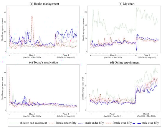 Monthly average access counts of (a) “Health Management” menu, (b) “My Chart” menu, (c) “Today’s Medication” menu, and (d) “Online Appointment” menu according to age and sex groups.
