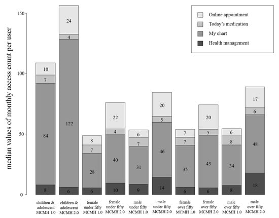 The median value of monthly access count per user in the “My Chart” menu increased from 15 to 16; particularly, it was the highest in children and adolescents in both MCMH 1.0 and MCMH 2.0 (27 and 29, respectively). In the “Online Appointment” menu, the median value of monthly access count per user increased from 3 to 8; particularly, it was the highest in children and adolescents in both MCMH 1.0 and MCMH 2.0 (4 and 10, respectively).