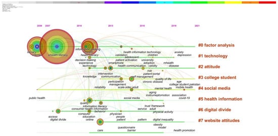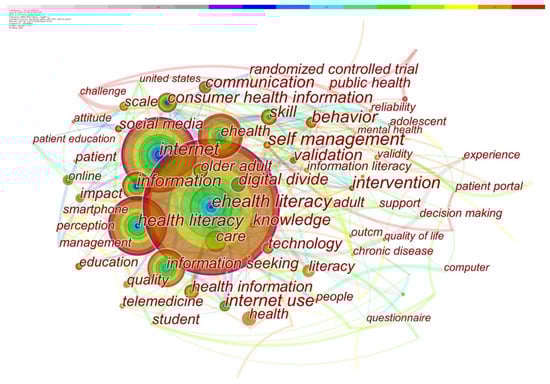 As seen from keyword clustering and thematic evolution, the research on ehealth literacy involves multiple subjects such as the elderly, college students, and patients with different diseases; analyzes a variety of health behaviors such as self-management, quality of life, and physical activity, as well as the digital divide caused by factors such as age and education; and develops relevant tools, as well as promoting ehealth through technology, social media, etc. Therefore, based on the co-word network of keywords, co-word timeline view, high-frequency keyword statistics, clustering, and thematic evolution path, and combined with the content of classical literature, this paper summarizes the ehealth literacy research into four topics: the evaluation of e-health literacy, the correlation between e-health literacy and health-promotion behaviors, influencing factors of e-health literacy, and interventions to improve e-health literacy.