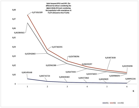 Ratio between the DPSU in the DCT system and the RPS (for different values of K): without the different impact of the digital divide (not considered, R1); considering the two different estimates of the digital divide at 73.8% (R2) and 83.3% (R3).