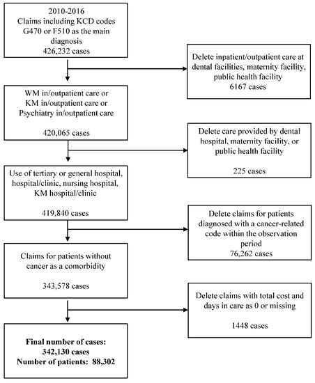 Among the claims submitted with Korean Standard Classification of Diseases (KCD) codes F510 or G470, cases with a code for dentistry or public health facility (6167 cases); cases with the type of institution listed as a dental hospital, maternity clinic, or public health facility (225 cases); cases of patients diagnosed with a cancer-related code during the observation period (76,262 cases); or cases with the total cost and number of days in care entered as 0 or missing (1448 cases) were excluded.