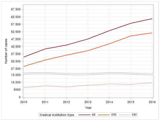 As shown in Table 1, a total of 9881 patients sought healthcare for insomnia in 2010, with 1303 visiting a KM facility and 8578 visiting a WM facility; in contrast, a total of 15,362 patients sought healthcare for insomnia in 2016, with 1826 visiting a KM facility and 13,536 visiting a WM facility. This finding indicates that the number of patients seeking medical care for insomnia increased annually over the 7-year study period (p-value < 0.0001). While the total number of cases seeking WM care tended to increase over the years, the number of patients seeking KM care did not increase markedly (Figure 2, Supplementary Figure S1). The total expense of care in WM consistently increased every year, while that in KM increased only slightly (Supplementary Figure S2). The average per-patient expense of care in KM remained similar over the 7-year period, while that of WM increased every year except for 2011. The average expense per case generally increased consistently over the years for WM, but the annual changes were not consistent for KM, with a higher average expense of care in KM than in WM (Supplementary Figure S3). The number of visits to healthcare facilities remained steady over the study period, and the number of visits to a KM facility was approximately two-fold higher than that to a WM facility (Supplementary Figure S4).