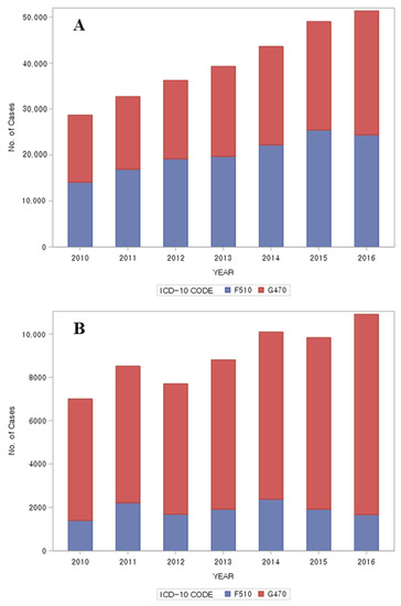 Number of cases per ICD-10 code F510, G470; (A): Western medicine; (B): Korean medicine. ICD-10 = International Classification of Diseases, Tenth Revision.