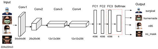 Improved AlexNet performed mask type classification feature. The input for training is image data with size 224 × 224 × 3 and the output is multi-class results with four labels, surgical, homemade, N95, no mask. The model was trained with 7014 images and validated with 2104 images. In