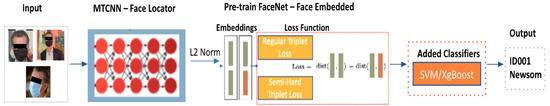 23]. In this study, our facial recognition pipeline is trained on masked face images, so we compared the pipeline performance on regular triplet loss from pre-train FaceNet model and triplet semi-hard loss function. Then we added different classifiers SVM and Xgboost after to extract face features and further compared the recognition accuracy.