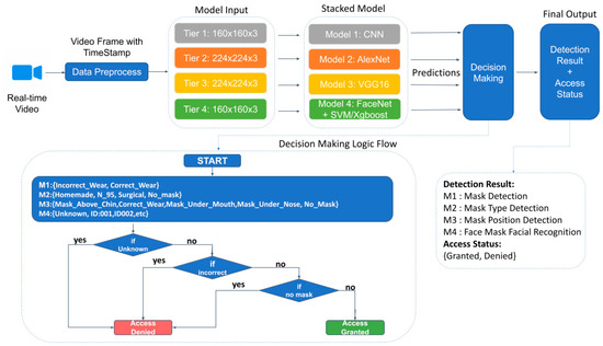 Figure 8 shows the stacking ensemble model architecture and the framework working flow. To acquire data, real-time video is processed by capturing video frames with timestamp and resizing to four tiers corresponding to required sizes for each model. Then input data feeds into the stacked model and the model generates a combination of predictions. The predictions include detection results for each feature, which are mask detection, mask type, mask position and identification. Besides the detection results, the predictions are used to determine access status as granted or denied by a decision-making process. If any of the prediction results contains any labels with no_mask, incorrect, or unknown, then the final output is presented with detection results and access status as denied. If the prediction contains labels as correct wear and identification, then the final output is presented with detection results and access status as access.