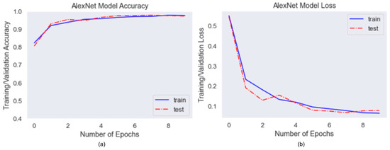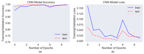 Figure 9 illustrates the accuracy and loss curves for 10 epochs. The train and validation accuracy curves converged and achieved an average of 97% accuracy. Even though both losses fluctuated, the gap between train and validation curves was acceptable.