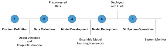 Figure 14, the full-life cycle of building the system includes problem definition, data collection, model development, model deployment, and DL system operations.