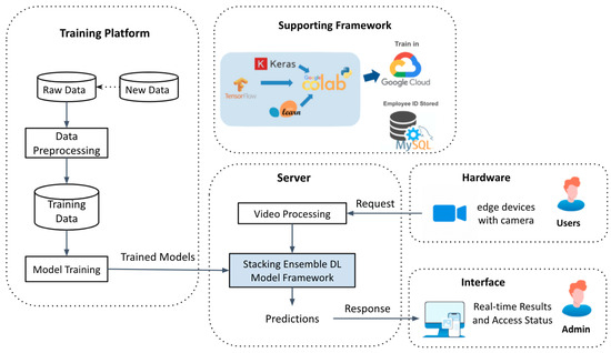 28]. Since each feature requires different input sizes, we resized the captured images. The resized images will be fed into each feature in parallel, and generate multiple combinations of predictions. Then, we used the Flask framework to support the ensemble deep learning models. For DL system operations, we build the infrastructure with the training platform and a server with core DL algorithms. The server can accept requests from the user side and respond with predictions on the interface for administration.