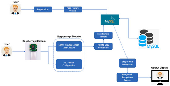 Figure 16 illustrates the data working flow. First, users need to register their identity. The system will extract the face features and send it to MySQL server to store it. When the user stands in front of the camera, the Sony IMX219 Sensor will capture multiple user’s images [