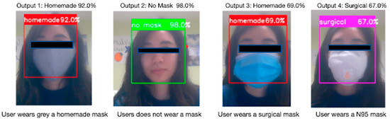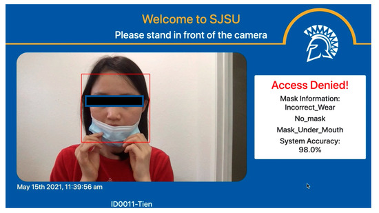 Figure 19 shows the system detention accuracy for face mask detection. There are four testing cases: mask not correctly worn, user wears blue mask, user wears N95, user covers face with clothes. Green boundary represents label with mask, and red boundary represents label without mask.