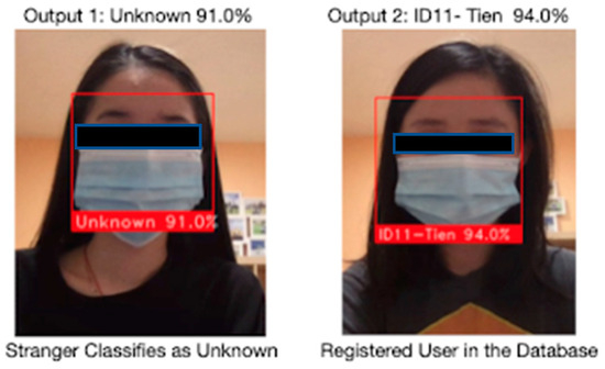 Figure 22 illustrates testing results on the feature face mask facial recognition. There are two testing cases: unregistered user and registered user. Unregistered users are defined as user facial information is not stored in the database and registered users are users with their facial information stored in the designated database. The system will label unregistered users as unknown and recognize registered users with stored user name and user id.