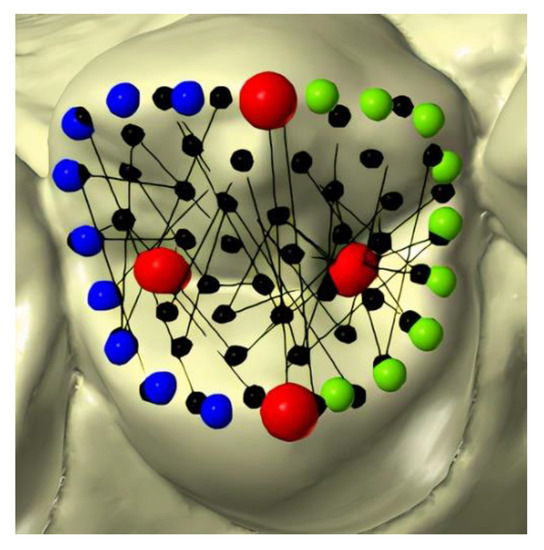 The distribution of landmarks (red points) and semi-landmarks (blue, green, and black points) on the tooth surface.