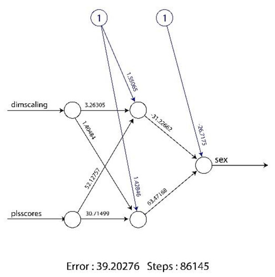 For the realization of the ANN, the number of hidden layers was two and they were chosen using the 10-K cross-method. Two neurons were included in the first layer and one neuron was included in the second layer (Figure 3). “Dimscaling” represents the centroid size and “plsscores” denotes the results of the PLS analysis of the Procrustes superimposition. The numbers on the lines indicate the weight associated with each vector. Circles represent nodes of the ANN, distributed on three layers.