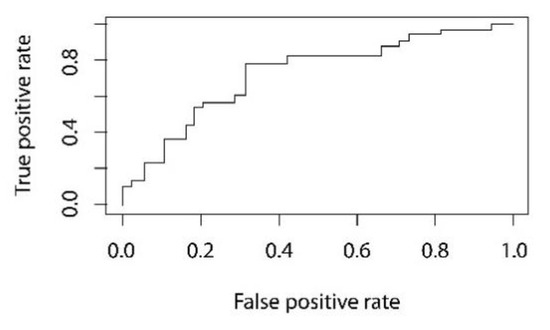 ROC analysis of the discrimination accuracy of the ANN. A threshold of 0.65 was used to optimize true-positive and false-positive rates.
