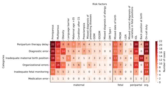Cross-tabulation of risk factors in preventable adverse events and their overarching categories as well as their frequencies (number of cases in color). Note. CS: cesarean section, GDM: gestational diabetes, IDGDM: insulin-dependent gestational diabetes, DM: diabetes mellitus, PROM: premature rupture of membranes, LGA: large for gestational age, IOL: induction of labor; org.: organizational.