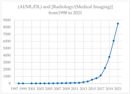 Radiology, especially medical imaging, is indeed one of the fields in medicine that has had the most successful applications of AI. Over the years, it has become an essential part of medical imaging. In fact, the lead author worked in the early time of applying AI to medical imaging for several years and coauthored multiple articles, including the ones listed below. There are many publications and use-case examples of AI applications in radiology and medical imaging. Since the field is rapidly expanding and evolving, the tools and best practices to minimize biases of AI in radiology or medical imaging have been proposed [32,33,34]. For example, we obtained the numbers of PubMed-listed articles [35] by limiting publications until the end of a full year of 2021, with an understanding that 2022 is not yet a full year: using Boolean operators, and let String A alone; String R alone; Strings A and R (simply denoted as AR), where D = (“Artificial Intelligence” or “Machine Learning” or “Deep Learning”) and R = (“Radiology” or “Medical Imaging). A PubMed search of DR = D and R, yielded 4290 articles since the first article appearing in 1998 until the end of 2021. The trend based on this literature search is displayed (Figure 1).