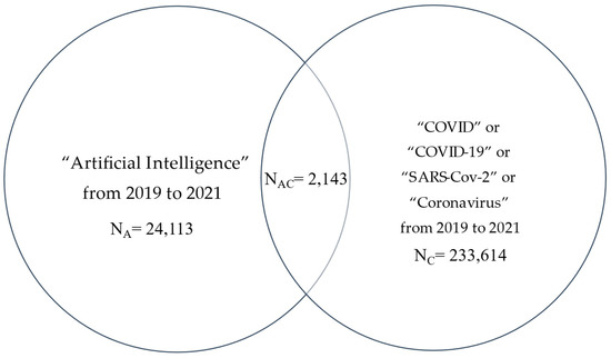 We obtained several numbers of PubMed-listed articles [32]. By using search terms and limiting publications from 2019 to 2021 inclusive and Boolean operators, we focused on: String A alone; String C alone; Strings AC = A and C, where A = “Artificial Intelligence” with nearly 35,000 articles, and C = (“SARS-CoV-2” or “COVID” or “COVID-19” or “Coronavirus”) with nearly 320,000 articles. In addition, a Venn diagram was used to demonstrate the overlap of AC with over 3000 articles in three years (Figure 2).
