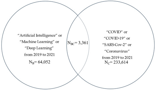 Similarly, we expanded the literature search using: String B alone; String C alone; String BC = B and C, where B = (“Artificial Intelligence” or “Machine Learning” or “Deep Learning”) to represent data science with over 64,000 articles, and again C = (“SARS-CoV-2” or “COVID” or “COVID-19” or “Coronavirus”) with 320,000 articles. The overlap of BC also yielded over 3000 articles during the same period (Figure 3).