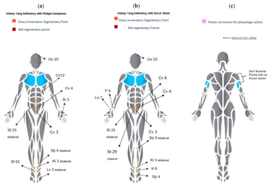 Points: Traditional Chinese medicine regards the PCOS condition as a mass development syndrome such as kidney Yang deficiency and phlegm plus dampness and/or blood stasis. So, treatment should address the resolution of dampness in the lower Triple Burner, eliminate stasis promoting blood circulation, thus leading to an improved Penetrating (Chong Mai) and Conception (Ren Mai) vessel communication, reinvigorate kidney Yang, harmonize Qi circulation in the spleen and lung vessels, and dispel possible internal heat as well as lead to a clear Shen. Chosen points for this study protocol are discriminated and justified in Table A1 and Figure 1a–c.