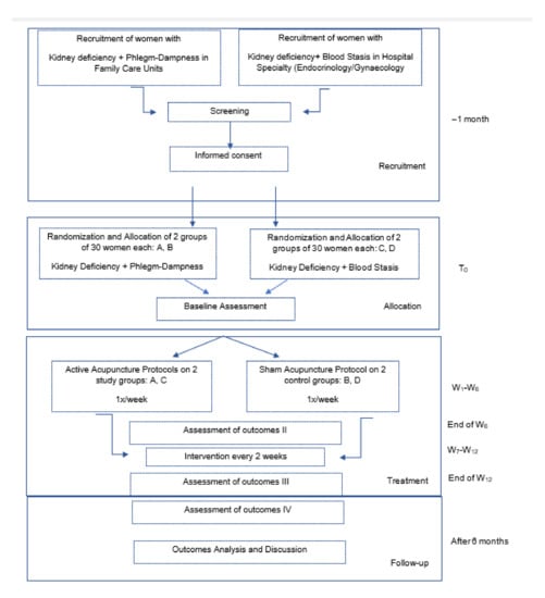 To overcome the described limitations found in the literature on PCOS women studies, we propose an RCT with a sample of 120 women. This large sample would be important to increase the probability of including participants from all 4 phenotypes of latest Rotterdam criteria. Additionally, we will include a control group. Not all the previous studies presented blank controls [54,56] which, in our opinion, will be fundamental to understanding the effect of acupuncture on the PCOS condition. The design of our study follows the SPIRIT checklist and the international guidelines recommended for every released RCT [57]. Our study design will use the traditional Chinese medicine diagnostic with the respective rationale for the general condition of PCOS and the specific symptoms or signs. Thus, patients will be divided into two main phenotypes according to the TCM pathomechanism proposed by Lyttleton (2013). Although reproductive cycle normalization is a common indicator of a healthy reproductive status, we think it is more accurate to use the increase of the ovulation rate, balance of sex hormones, and improvement of the metabolic profile as the main indicators of the efficiency of the trial. For this reason, we suggest a study where the analysis of the results is divided in three parts: primary, secondary, and exploratory outcomes.