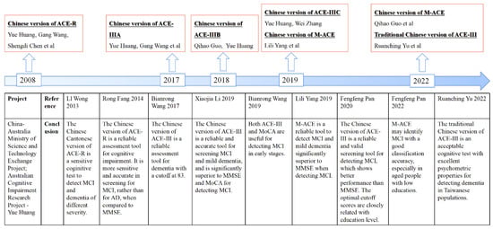The history of Chinese versions of ACE [23,24,36,37,39,40,42,43,44]. Abbreviations: ACE, Addenbrooke’s Cognitive Examination; ACE-R, Addenbrooke’s Cognitive Examination-Revised; ACE-III, Addenbrooke’s Cognitive Examination III; M-ACE, Mini-Addenbrooke’s Cognitive Examination; MMSE, Mini-Mental State Examination; MoCA, Montreal Cognitive Assessment; MCI, mild cognitive impairment; AD, Alzheimer’s disease.