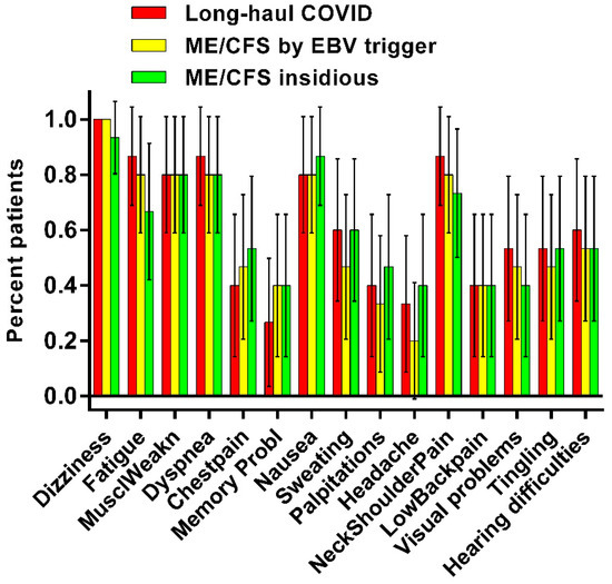 In a previous study, we compared long-haul patients with POTS with a matched ME/CFS control group with POTS, with ME/CFS patients with a normal heart rate and blood pressure response during a tilt test and with healthy controls [15]. The prevalence of symptom clusters and the objective signs of orthostatic intolerance (cerebral blood flow reductions during a tilt test) were similar between long-haul COVID patients and the two ME/CFS groups. As the onset of ME/CFS is regarded to be mainly triggered by an Ebstein-Barr virus (EBV) [16,17]; in the present retrospective study, we compared 14 long-haul COVID patients with 14 gender- and age-matched ME/CFS patients whose onset was triggered by EBV. Furthermore, a significant subset of ME/CFS patients who have no clear trigger for the start of the disease: an insidious onset [17]. To explore whether there are differences between the acute, viral onset and the insidious onset, we also included 14 gender- and age-matched ME/CFS patients with an insidious onset of ME/CFS.