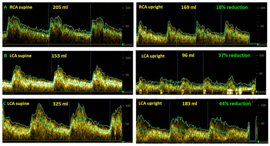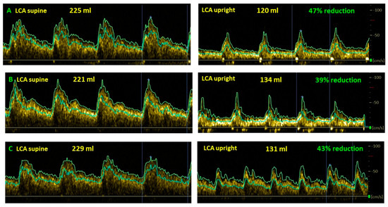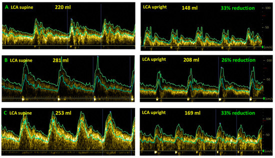 Examples of cerebral blood flow decrease while upright compared to supine in long-haul COVID patients. (A): female, 37 years old; (B): female, 35 years; (C): female, 24 years, LCA: left carotid artery.