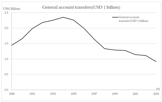 The most important reason for the reorganization into an independent administrative agency was to reduce or to eliminate the transfer of funds from the national budget to the national hospitals [5,10]. For example, as shown in Figure 1, about USD 1 billion (USD 1 = JPY 110) was transferred from the national general account in 2003 and about USD 2.35 billion at the peak in 1994 [13,14,15,16]. Therefore, improving the management and the efficiency of medical care (i.e., increasing healthcare “sales” and operating on a low budget) became the most important mission of the NHO. The NHO achieved a surplus for five consecutive years by restricting the new investment and securing the human resources, with the aim of increasing the medical treatment profit in the first five-year period (April 2004 to March 2009) [17]. In the second period, the investment was gradually resumed, with a further reduction in hospital beds and attempts to reduce the costs of materials, etc.; the current account balance exceeded 100% each year [4,18]. In the third period, increasing the number of medical staff in order to obtain higher reimbursement without changing the business structure led to an imbalance between the labor costs and the medical business income gradually becoming apparent. These results were evaluated by the Independent Administrative Institution System Evaluation Committee and were published as evaluation results by the competent minister, the Minister of Health, Labor and Welfare [7,8,9]. As a result, the “III. Matters Related to Improvement of Financial Condition” was rated “S” (much above target) or “A” (target achieved) in the first and second periods, but “B” (treated as achieved but some targets did not achieve) in the third period. To the best of our knowledge, no further detailed investigation of these issues has been conducted. In this study, we focused our analysis and review on the financial relations that were rated the final score of “B” in the third period. (Table 2).