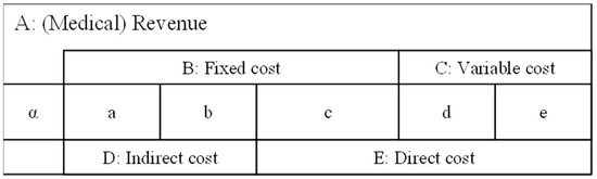 PL structure A: (Medical) Revenue, B: Fixed cost, C: Variable cost, D: Indirect cost, E: Direct cost, α: Medical profit, a: Depreciation for a hospital, b: Maintenance cost for a hospital, c: Labor costs, d: Cost of medical materials, e: Food expenses. A = α + B + C = α + D + E, B = a + b + c, C = d + e, D = a + b, E = c + d + e.