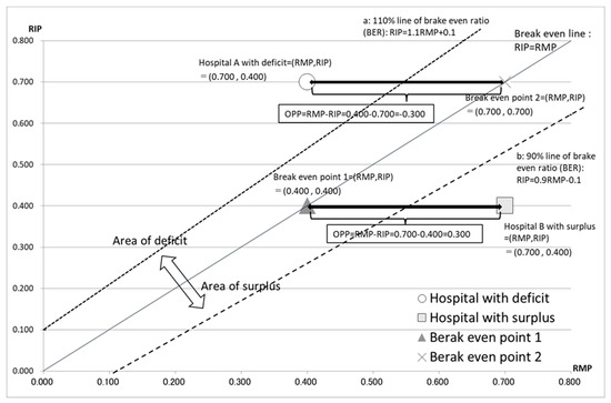 The relationship between RMP, RIP, OPP, and the break-even line. Hospital A, with a deficit, is shown as (RMP, RIP) = (0.400, 0.700). Hospital B, with a surplus, is shown as (RMP, RIP) = (0.700, 0.400). The line RIP = RMP is the break-even line. Line “a” represents 110% of the break-even ratio (BER): RIP = 1.1RMP + 0.1, calculated by the formula: RIP = BER (RMP + 1) − 1. Line “b” represents 90% of the BER: RIP = 0.9RMP − 0.1. The width between hospital A and BEP of 0.400 − 0.700 = −0.300 shows the operating profit per USD 1 of personnel cost (OPP) of hospital A. The width between hospital B and BEP of 0.700 − 0.400 = 0.300 shows the operating profit per USD 1 of personnel cost (OPP) of hospital B. The area over the BER line is the deficit area and that below the BER line is the surplus area.