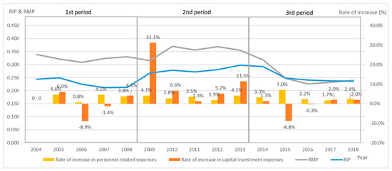 Figure 5 and Figure 6 demonstrate the relationship between the RIP, the RMP, and the rate of increase in the personnel-related expenses in each group.