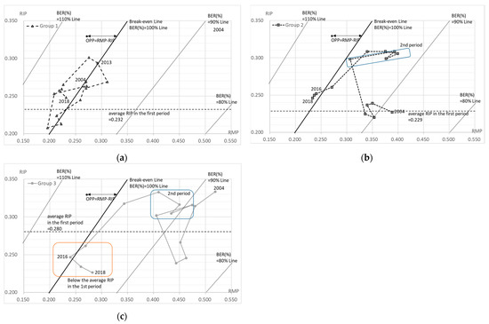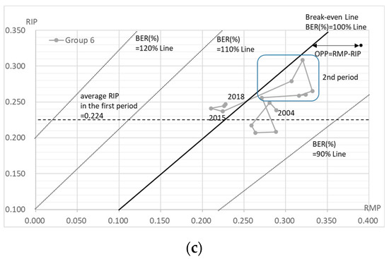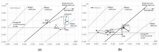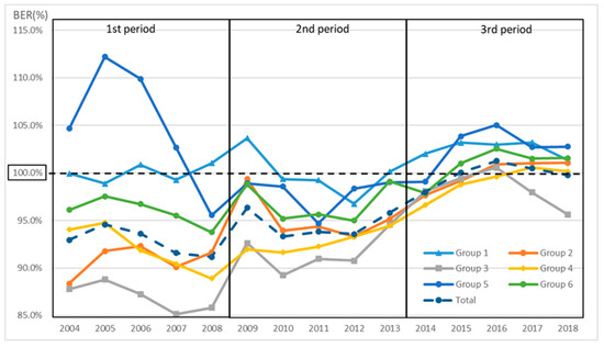 The BER (%) can also be read in Figure 5 and Figure 6. It is shown as the range of each BEP, which is indicated by RIP=BEP (RMP+1) −1. Furthermore, Figure 7 shows the BER (%) for each group for each year, where a BER (%) above 100% means a deficit and a BER (%) below 100% means a surplus. Period one was the best situation in total, although the second period was seen to be in a better business position. In total, the BER (%) was worse in periods one, two, and three. In addition, all but group 3 were in the red in FY 2017 and FY 2018.
