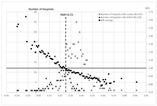 Calculation of BER for each RMP in groups 1, 2, and 3 for all 15 years. The BER shows the average of all hospitals with each RMP value. The number of deficit and surplus hospitals for all years was disaggregated by the RMP value. Most surplus hospitals were located above RMP = 0.25, while most deficit hospitals were located below 0.25. On the other hand, the average BER crosses the line of RMP = 0.25 between surplus and deficit hospitals. This indicates that RMP = 0.25 is a critical point in terms of management.