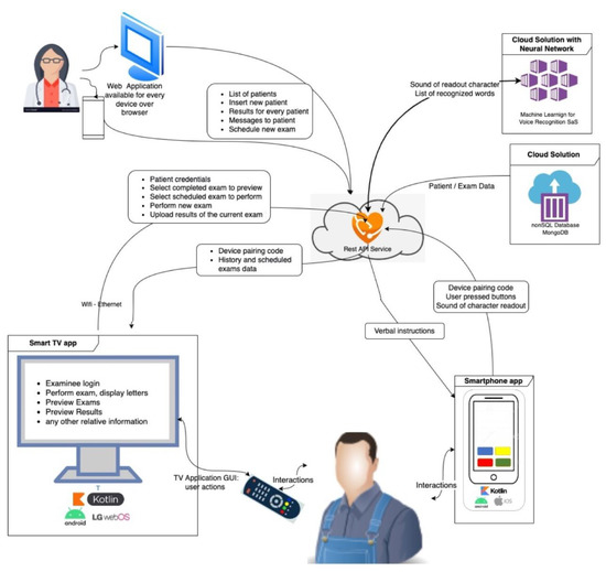 To address the aforementioned prerequisites, DDiVAT was built as a System-as-a-Service (SAS) with the following primary components: (a) a DDIVAT administration site; (b) a smart TV application (TV-app); and (c) a smartphone app (SP-app). DDiVAT’s VA self-examination mode required several advanced services; among them: (a) voice guidance; (b) voice recognition; and (c) automatic calculation of VA scores. In detail, DDiVAT SAS consisted of: