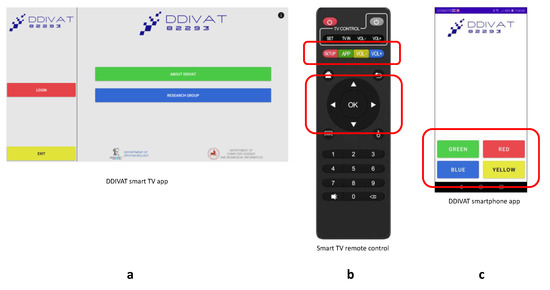 DDiVAT color-based navigation: (a) DDiVAT smart TV-app; (b) Smart TV remote control; (c) DDiVAT SP-app.