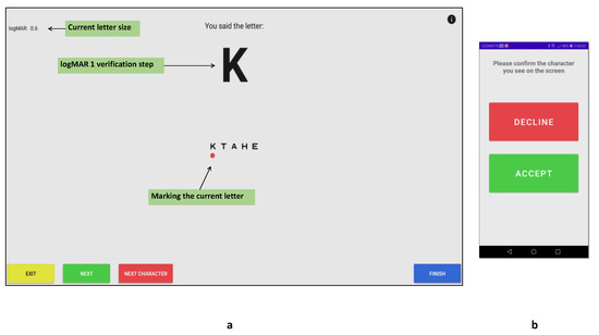 logMAR 1 verification step: (a) DDiVAT’s TV-app verification screen; (b) DDiVAT’s SP-app verification screen.