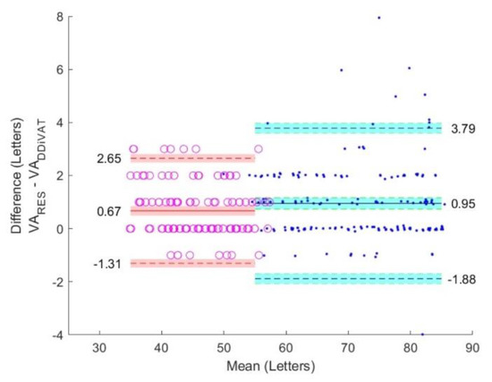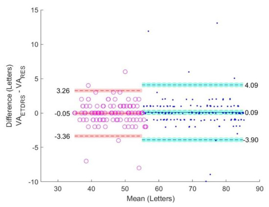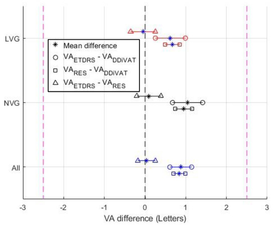 The VAETDRS, VARES, and VADDiVAT are presented in Table 3 for all participants as well as for NVG and LVG. Figure 6, Figure 7 and Figure 8 show Bland–Altman plots evaluating differences between VAETDRS and VARES, between VARES and VADDiVAT, and between VAETDRS and VADDiVAT, (in letters) for both NVG and LVG.