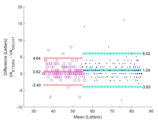 A noninferiority test was performed between VAETDRS, VARES, and VADDiVAT with a margin of 2.5 letters according to former reports [22]. The level of agreement among the three VA methods was evaluated with the intraclass correlation coefficients (ICCs) and using Bland–Altman plots. Test-retest reliability of the VADDiVAT was evaluated by ICCs.