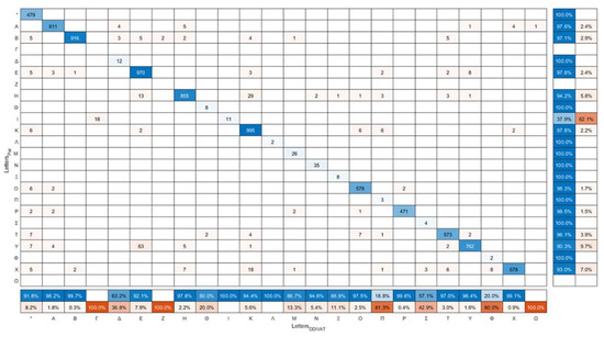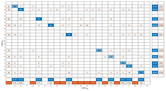 The confusion matrix of the letters displayed in the smart TV (LettersTV) versus the letters that were read by the participants (LettersPar) is presented in Figure 10. The sum of each row is the actual number of appearances of each letter in the TV-app, whereas the sum of each column is the number of times that each letter was said by the examinees. The numbers in the main diagonal correspond to the letters that were correctly identified by the examinees. It has to be mentioned that, although DDiVAT displays only 10 Latin characters (A, B, E, H, K, O, P, T, Y, X), the confusion matrix contains almost all the characters of the alphabet, since the examinees occasionally incorrectly read non-displayed characters. This could be verified by the fact that only the rows of the aforementioned Latin characters have a non-zero sum. The star symbol “*” indicates cases in which the examinee declared that he/she was unable to read the displayed letter. The true positive rate (TPR) (or recall, or sensitivity) and false negative rate (FNR) in examinee-reading for each letter is summarized in the additional column on the rightmost of the confusion matrix. The row at the bottom of the confusion matrix shows the positive predicted value (PPV) or precision, and the false discovery rate (FDR) of patient-reading for each letter.